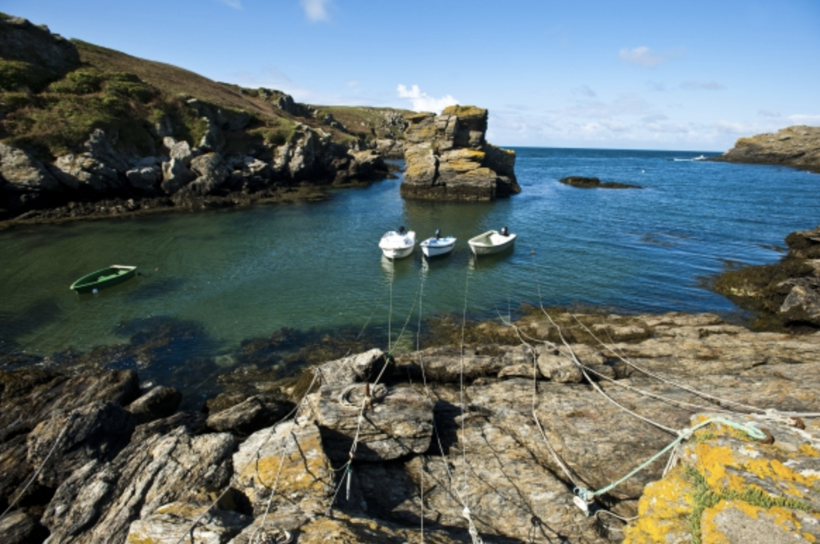 Pour la pause-déjeuner, nous vous conseillons le port Saint-Nicolas, situé au sud-ouest de l’île. Il s’agit d’un port naturel, niché dans une jolie crique au milieu de la côte sauvage. C’est un endroit idéal pour jeter l’ancre. Les plus petits bateaux sont amarrés à un gros rocher appelé « Rocher de la Vache ». Situé au beau milieu de la crique, il est imposant et rend l’endroit unique. Vous serez entouré de hautes falaises couvertes de bruyère et n’aurez qu’à vous asseoir, ouvrir les yeux et profiter du paysage !