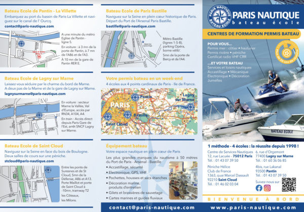 Le bateau-école « Paris Nautique », spécialisé dans la formation aux différents permis bateau depuis 1998, est reconnu pour la qualité de ses formations et son professionnalisme. Il est situé aux quatre points cardinaux de Paris : Saint-Cloud, Paris Bastille, Pantin et Lagny sur Marne.