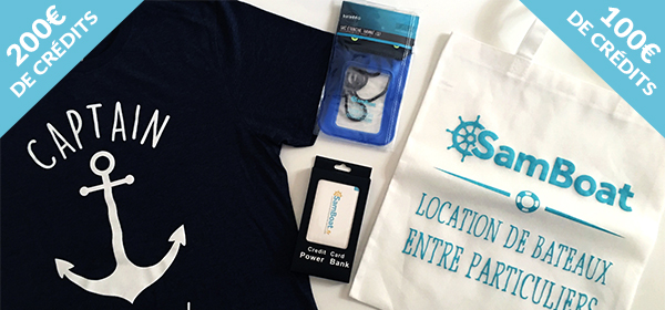 LOT N°1. Un bon de 200€ en crédits bateaux à utiliser sur une prochaine location, un T-Shirt « Captain Samboat », un sac de plage, un PowerBank pour recharger votre mobile, une pochette étanche SamBoat.