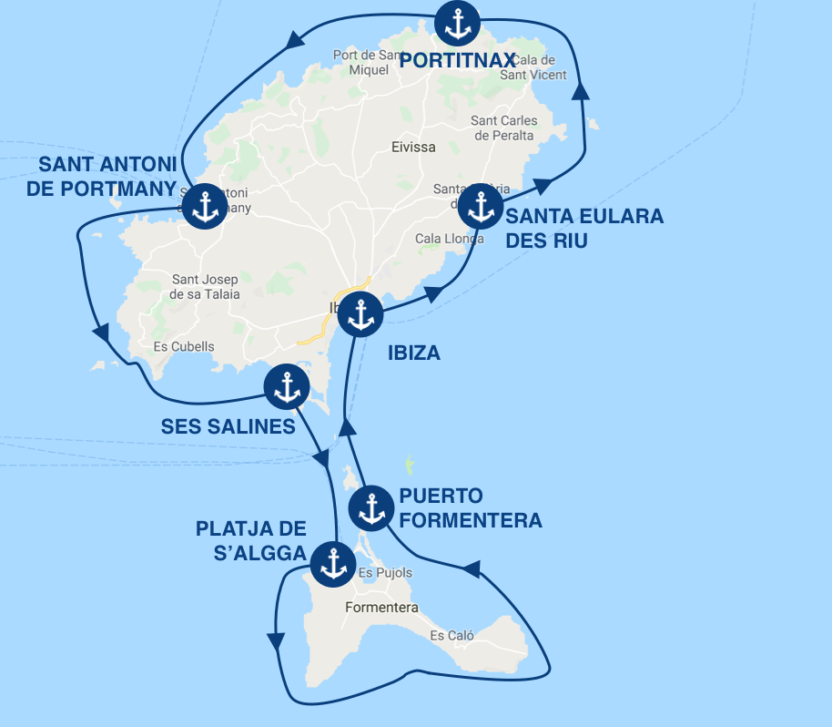 Comme vous l’aurez compris, on vous emmène dans les îles d’Ibiza et de Formentera pendant 7 jours. Ne vous étonnez pas si les prononciations des villes sont différentes : on vous rappelle qu’aux îles Baléares, on parle le catalan et le castillan (langue espagnole courante).