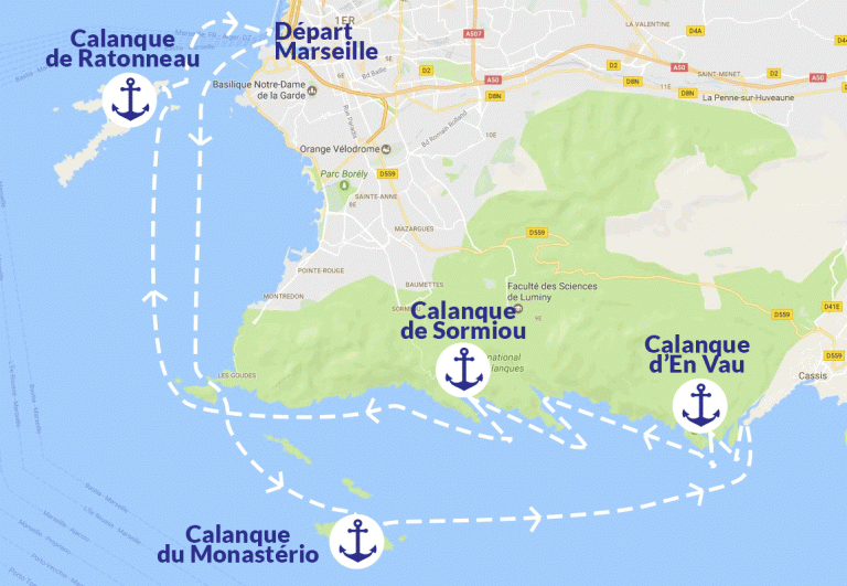 La meilleure façon de visiter les calanques, c’est bien évidemment par bateau pour découvrir non pas une, mais plusieurs calanques ! SamBoat vous livre tous les secrets de la région et vous a préparé un itinéraire de rêve pour une journée complète, qui éblouira petits et grands tout au long de la balade. Pour un accueil chaleureux et pour obtenir des informations sur nos horaires d’ouverture, nous vous conseillons de prévoir un départ vers 9h00 et un retour vers 18h00, sur un bateau à moteur au départ du Port de Marseille ou de la Pointe-Rouge. L’arrivée à Marseille est prévue à 18h00, ce qui vous permet de planifier votre journée en toute sérénité.