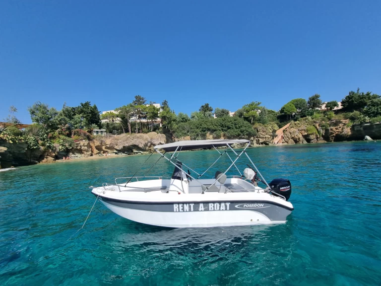 Bienvenue sur notre bateau à moteur Poseidon 170. Ce bateau vous offre la possibilité de le piloter sans permis de skipper car il possède un moteur de moins de 30/40 CV. Nous vous donnerons quelques conseils et vous serez prêt pour votre croisière. Le bateau est équipé d'un GPS, d'une carte et d'un téléphone portable qui vous permet d'appeler gratuitement en cas d'urgence. Il y a aussi un réfrigérateur pour stocker vos aliments et boissons. Vous pouvez passer une journée fantastique à explorer Agia Pelagia, à nager dans les eaux bleues claires de la Crète et à vous détendre sous le soleil estival de la Grèce ! Le bateau est parfait pour des croisières en famille. Vous pouvez louer le bateau pour une croisière d'une demi-journée de 4 heures ou pour une journée complète de 8 heures. Le POINT DE DÉPART est à la plage d'Agia Pelagia. Depuis le POINT DE DÉPART, vous pouvez naviguer sur 7 kilomètres à gauche et à droite du point et vous éloigner jusqu'à 3 milles nautiques de la côte. Le carburant est en supplément