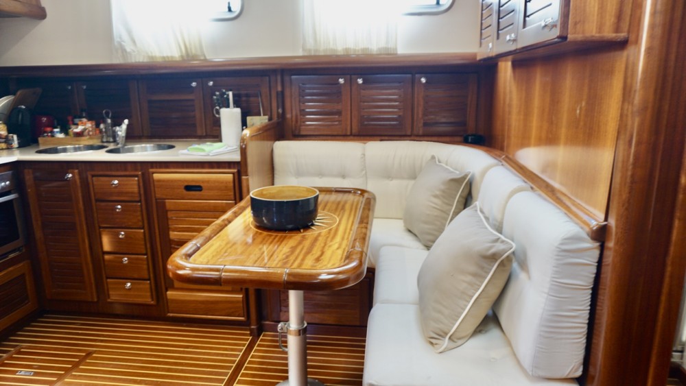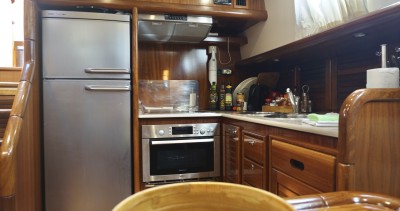 A l'intérieur on trouve 4 cabines, 2 toilettes, salon, cuisine équipée, climatisation, TV...tout est conçu pour passer de longues journées à naviguer.