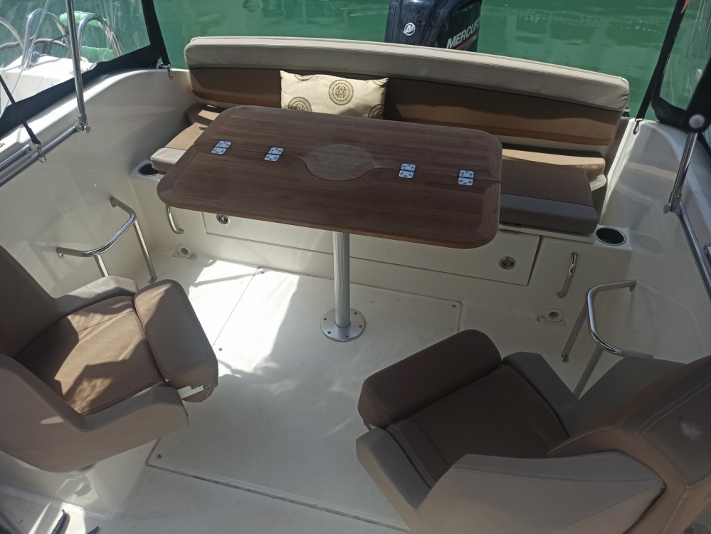Taud de soleil, douche d'eau douce, table en teck, chaîne hi-fi avec connexion Bluetooth, sondeur avec transducteur et traceur.