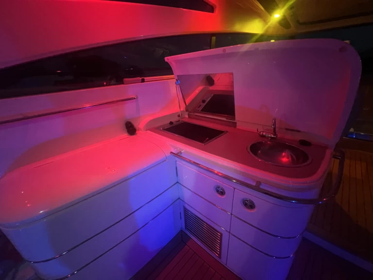L'intérieur : le yacht offre deux cabines avec lits doubles, chacune avec sa propre salle de douche. Une cabine avec un lit double et un lit simple en hauteur. Une cuisine entièrement équipée.