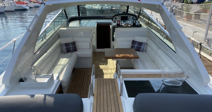 A disposizione dei nostri ospiti ampi spazi esterni, tra cui una comoda area di poppa, un grande prendisole a prua ed un vasto pozzetto che permette una visibilità a 360° riparati dall’immenso cristallo e dall’hard top. All'interno tre cabine di cui una camera armatoriale con matrimoniale all’italiana, bagno dedicato e doccia separata, una camera vip con letto matrimoniale alla francese, bagno dedicato e doccia separata, una camera ospiti con due a letti singoli in piano unificabili con accesso al secondo bagno. A poppa, separata dalla zona notte di prua, trova posto un'ampia cucina dotata di ogni comfort con annesso salotto a ferro di cavallo e tavolo in tek. Sotto il pozzetto è situata la cabina di servizio con wc. Ogni locale è dotato di clima e riscaldamento autonomo. Un refitting completo è stato effettuato nel 2020.