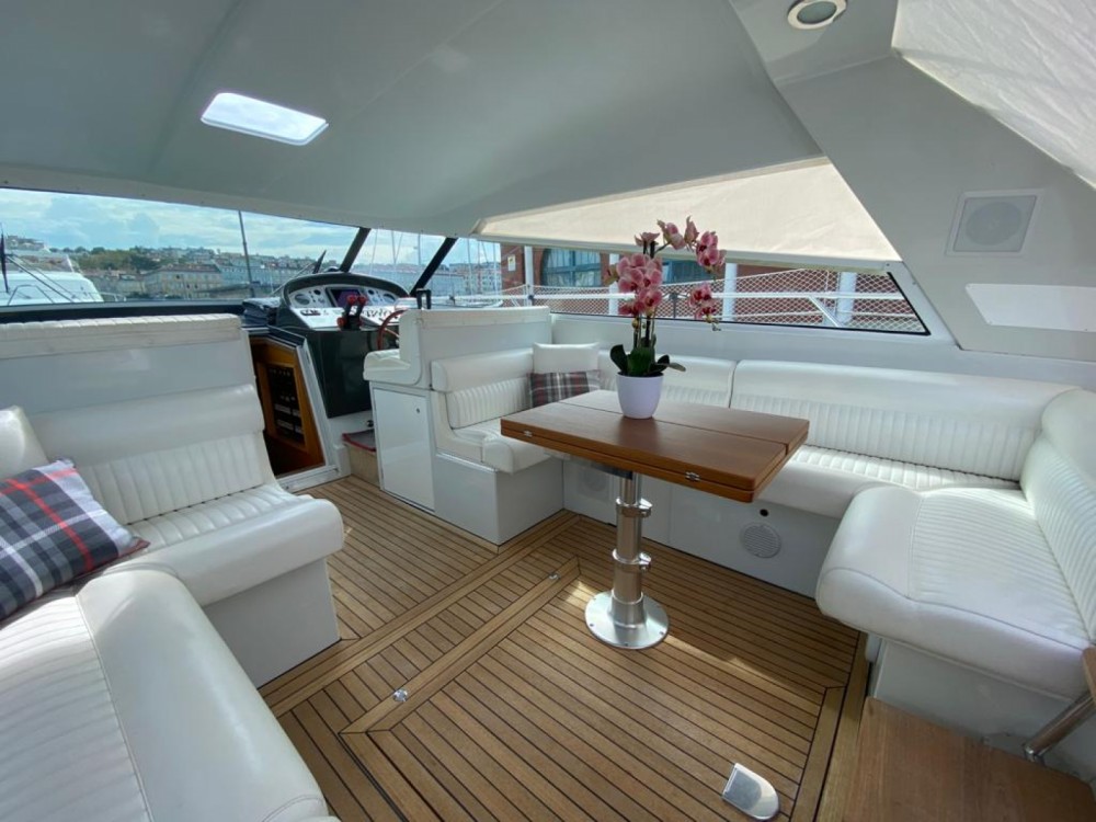 De grands espaces extérieurs sont à la disposition de nos invités, dont un espace arrière confortable, un grand bain de soleil à l'avant et un grand cockpit qui permet une visibilité à 360° abrité par l'immense vitre et le hard top. A l'intérieur trois cabines dont une chambre propriétaire avec un lit double à l'italienne, salle de bain dédiée et douche séparée, une chambre VIP avec un lit double français, salle de bain dédiée et douche séparée, une chambre d'amis avec deux lits simples de plain-pied pouvant être réunis avec accès à la deuxième salle de bain. A l'arrière, séparée de l'espace nuit avant, se trouve une grande cuisine équipée tout confort avec un salon attenant en forme de fer à cheval et une table en teck. La cabine de service avec toilettes est située sous le cockpit. Chaque chambre est équipée d'une climatisation réglable et d'un chauffage indépendant. Un refit complet a été réalisé en 2020.